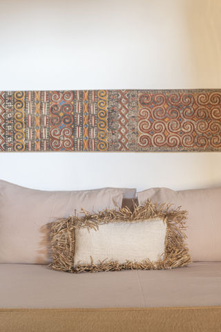 The interiors feature the signature Kindigo touch, blending African influence and tribal art with Balinese craftsmanship. The dark wood of the joglo contrasts elegantly with the warm whites of the bedrooms, while petrol-blue and turquoise accents enliven the sofa area. Monochrome details add depth and character, completing a harmonious design that captivates and sets Villa Tile apart.